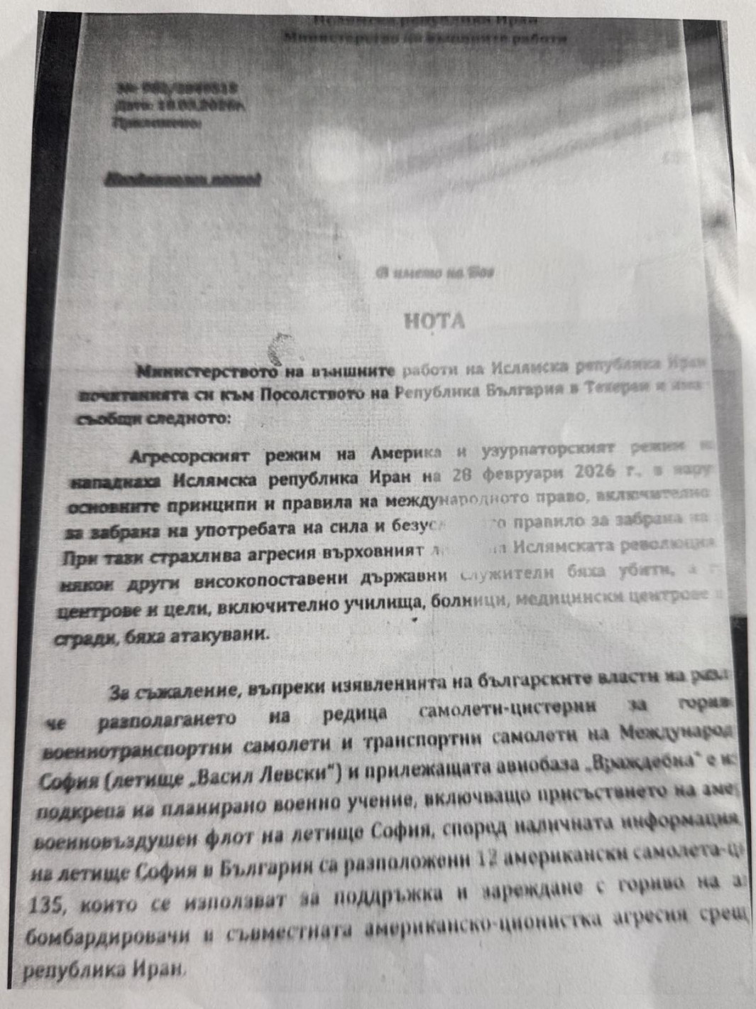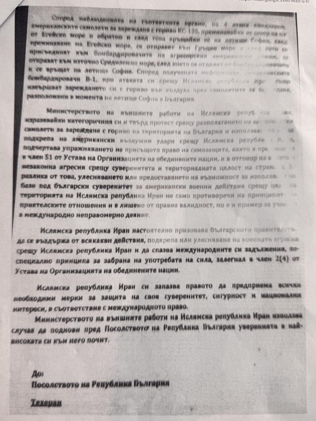 Той посочи, че има нота от Иран до Министерство на външните работи на България. В нея се заявява, че агресорският режим на Америка и узурпаторският режим на Израел са нападнали Иран в нарушение на международното право.