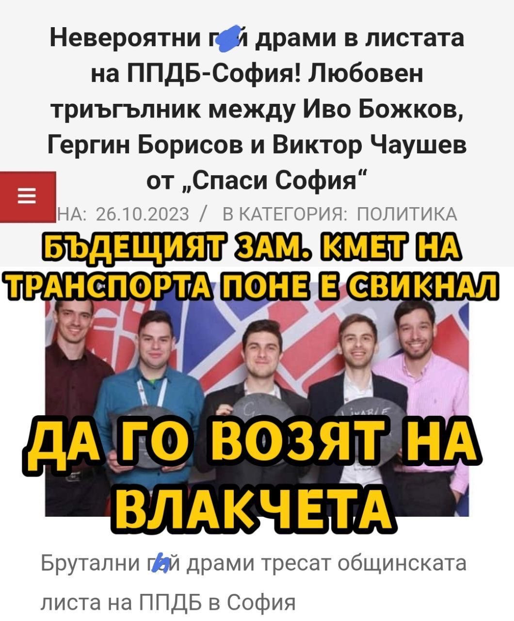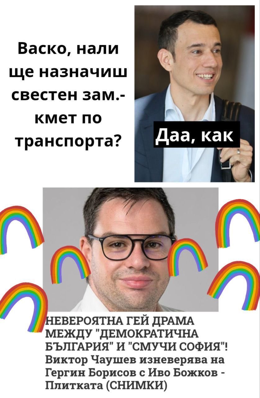 Суингингът при тях датира още от предишните местни избори през 2019 г.  Тогава Чаушев, един от петимата основни активисти от „Спаси София“, напусна доскорошните си събратя и мина на другия фронт – като кандидат за общински съветник в конкурентната тогава листа на ДБ. Причината не бе тривиална, а сексуална.  Чаушев зарязал интимния си партньор Гергин Борисов (кандидат за общински съветник от „Спаси София“), изневерявайки му с общинския съветник от „Демократична България“ Иво Божков.”, пише ПИК.